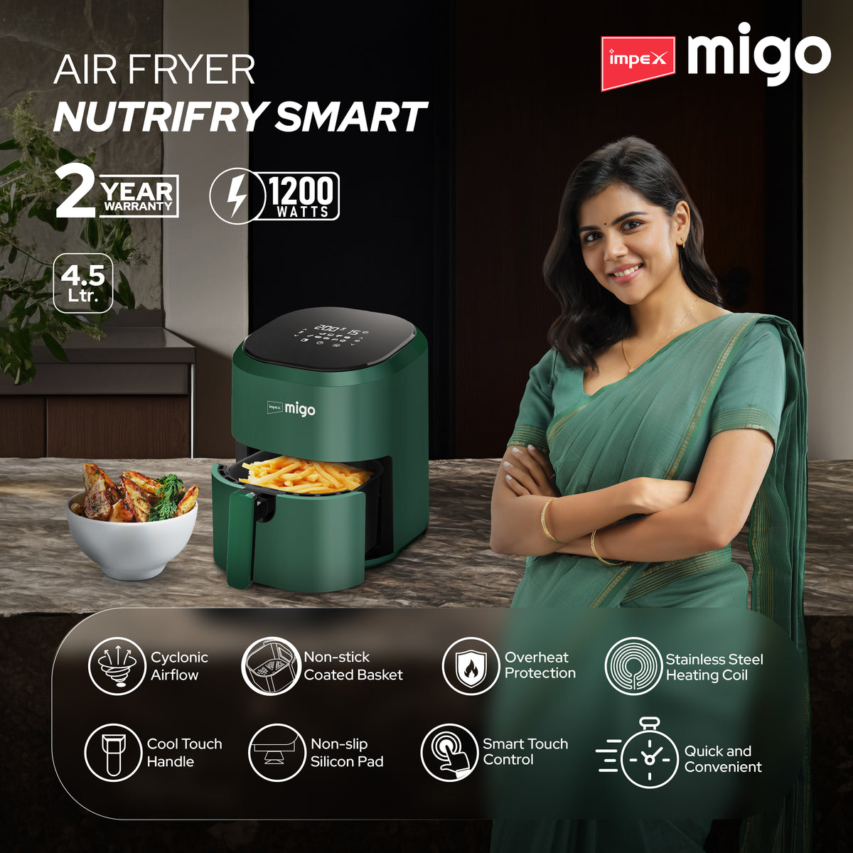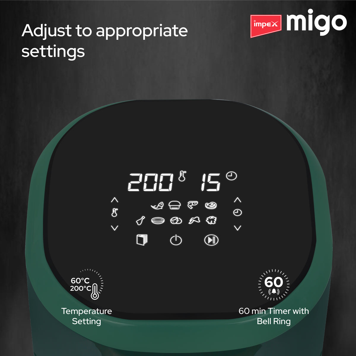 Impex Migo Digital Air Fryer 10 in 1 Airfryer, 1200 W Oil-free Cooking 4.5 L Instant Electric Air Fryer for Home Auto Cut Off, Fry, Grill, Roast, Steam, and Bake 2 Years Warranty (Green)