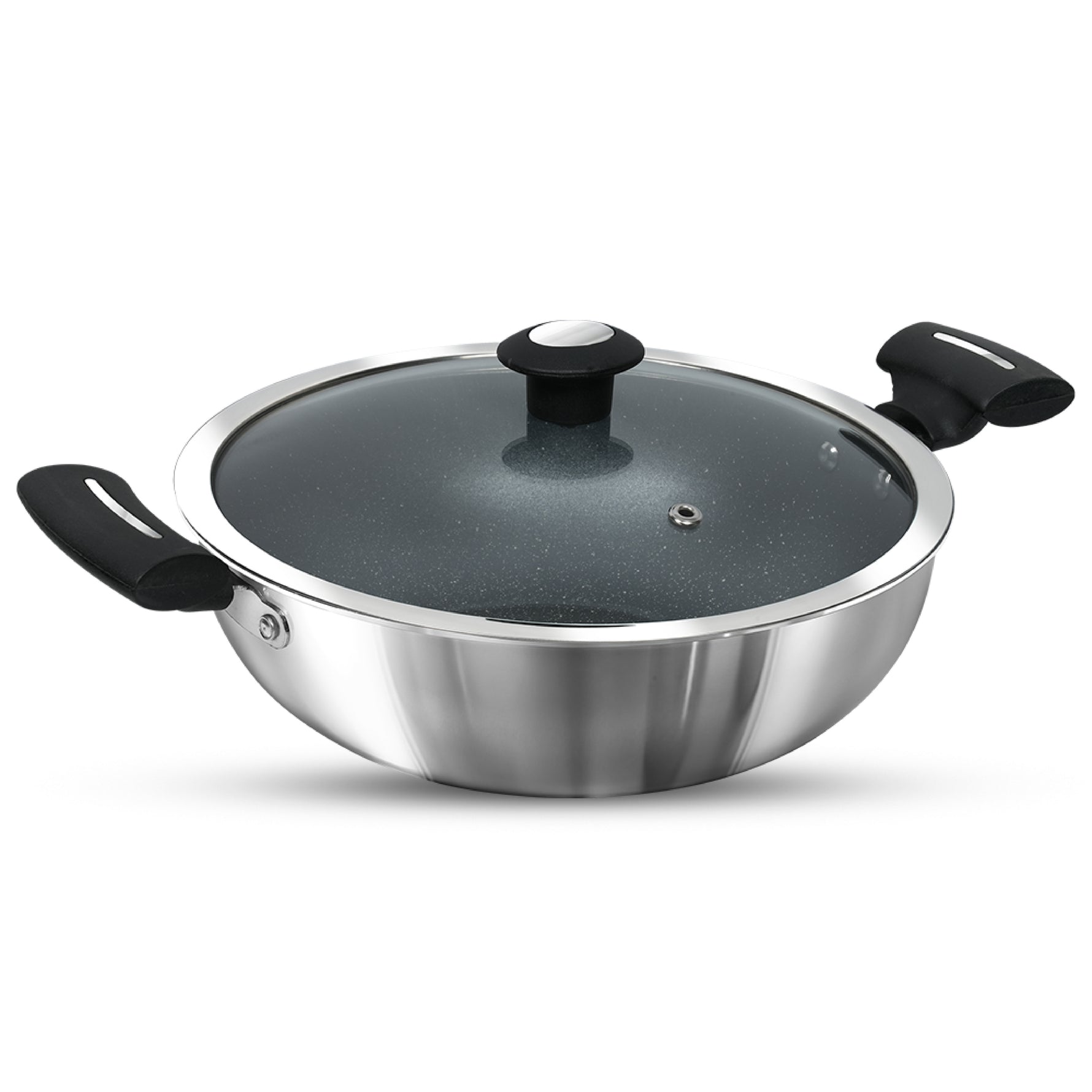 With a substantial 24 cm diameter, it's large enough to accommodate various cooking needs, and its dishwasher-safe feature adds to the convenience. The chrome-plated direct riveting handle not only offers a secure grip but also adds an elegant touch to your cookware. The stainless steel exterior of the Kadai Pan enhances its aesthetic appeal, while the stick-free interior makes sure your dishes effortlessly slide off the surface.