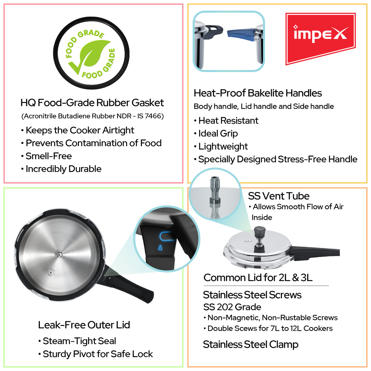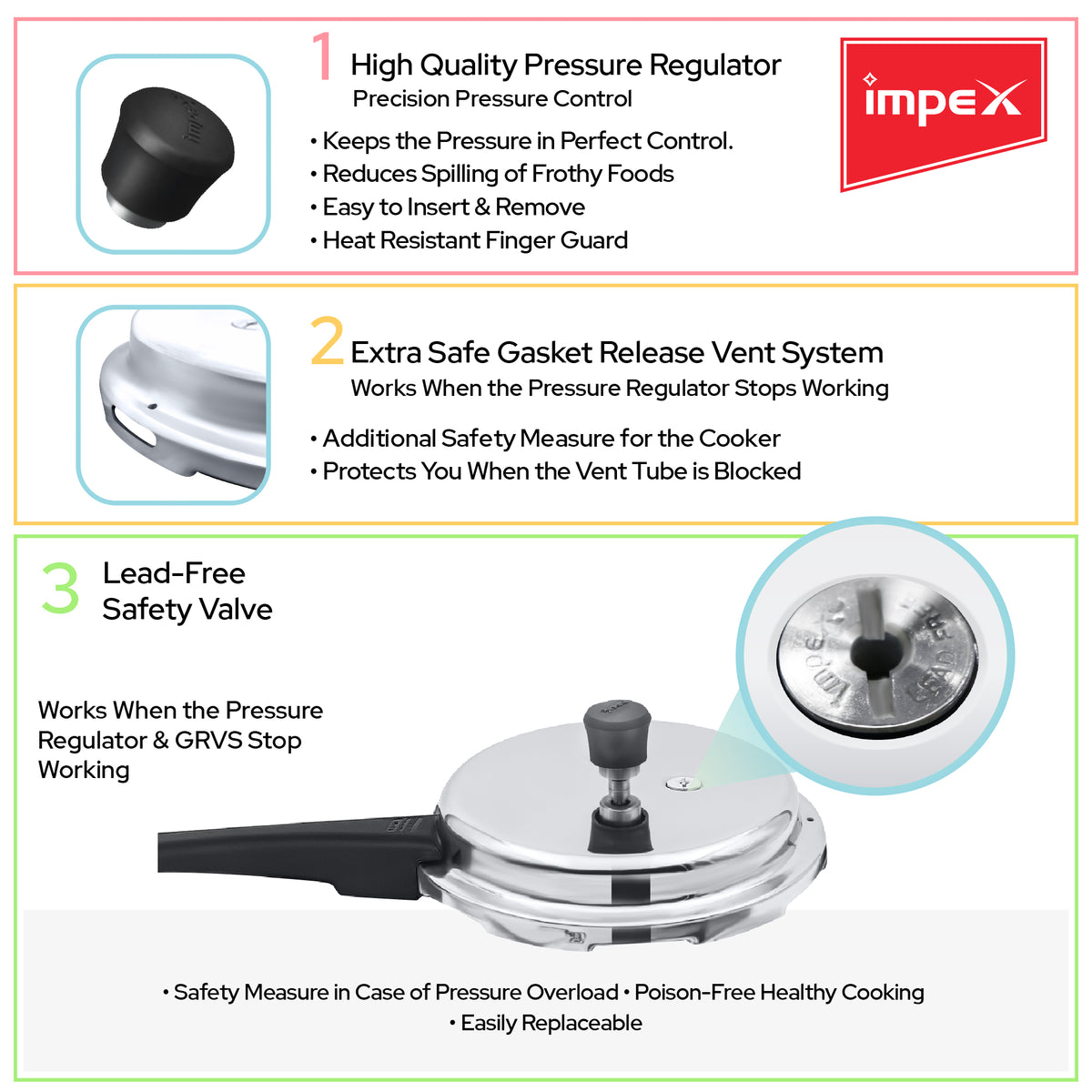 - The Impex Pressure Cooker Come With High-quality aluminium construction ensures durability and excellent heat distribution for consistent cooking results