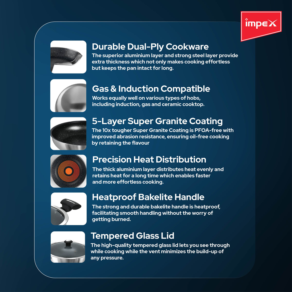 A key feature of this Sauce Pan is its 5-layer granite coating, which is 10 times tougher than standard nonstick coatings, promising long-lasting performance. Impex stands behind the quality of this product by offering a 1-year domestic warranty. The sales package includes one Sauce Pan and a glass lid, making it a valuable and versatile addition to your kitchen for various cooking needs. Whether you're preparing soups, sauces, or stews, the Impex Sauce Pan is your reliable and durable kitchen companion.