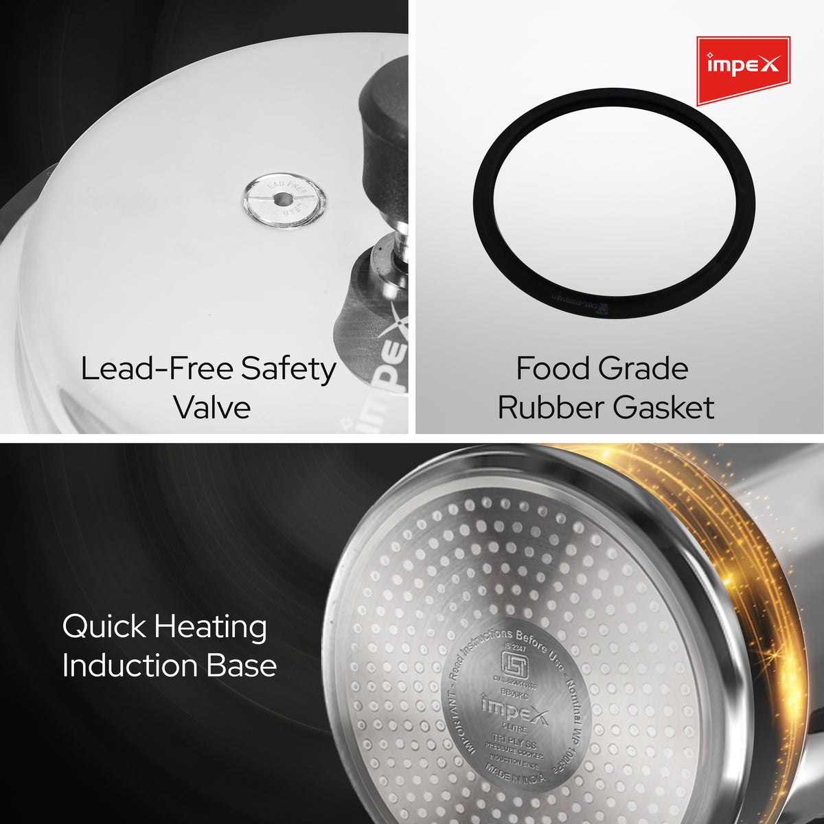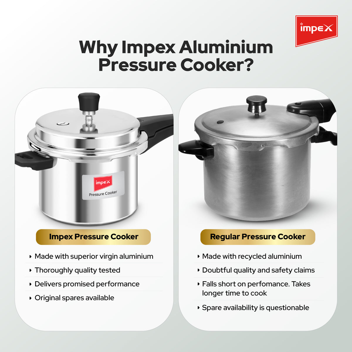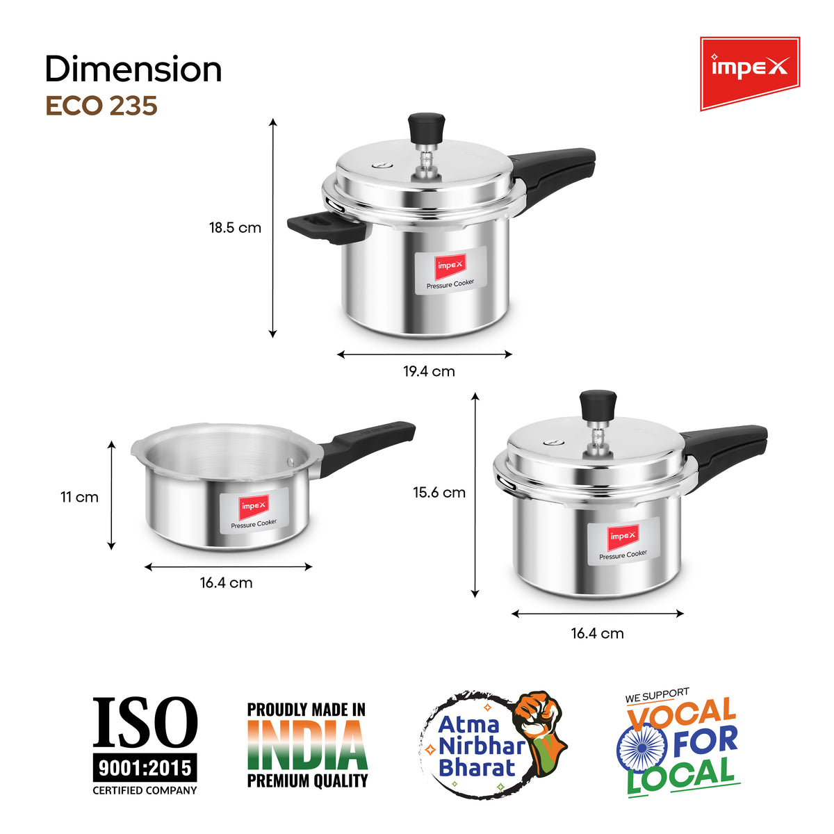 The Impex ECO 235 Aluminium Pressure Cooker Combo is a versatile and essential addition to any kitchen. This family combo pack includes three pressure cookers of different capacities (2L, 3L, and 5L), all made from high-grade Super virgin Aluminium (8011 grade) for durability and efficient cooking. Featuring a quick-heating induction base and a Controlled Grv System, it ensures fast and efficient cooking. The sturdy, heat-proof handles provide a safe and comfortable grip, while the ISI certification guarantees quality and reliability.