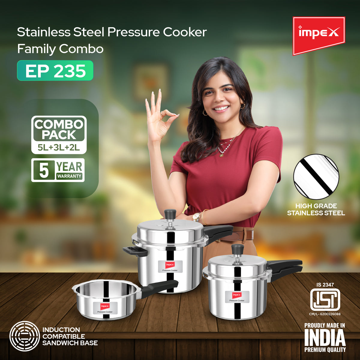 The Impex EP 235 Stainless Steel Pressure Cooker Combo is a versatile and essential addition to any kitchen. This family combo pack includes three pressure cookers of different capacities (2L, 3L, and 5L), all made from high-grade stainless steel for durability and long-lasting use. Featuring a quick-heating induction base and a Controlled Grv System, it ensures fast and efficient cooking. The sturdy, heat-proof handles provide a safe and comfortable grip, while the ISI certification guarantees quality and reliability.