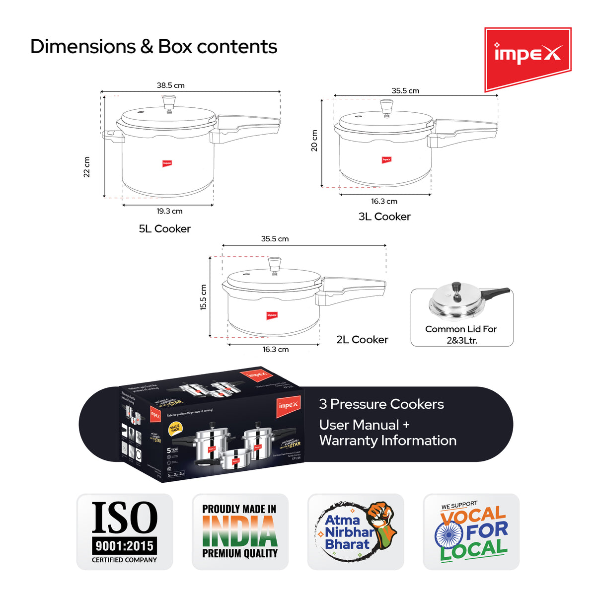 Complete Family Combo: Includes 2L, 3L, and 5L pressure cookers to meet all your cooking needs.