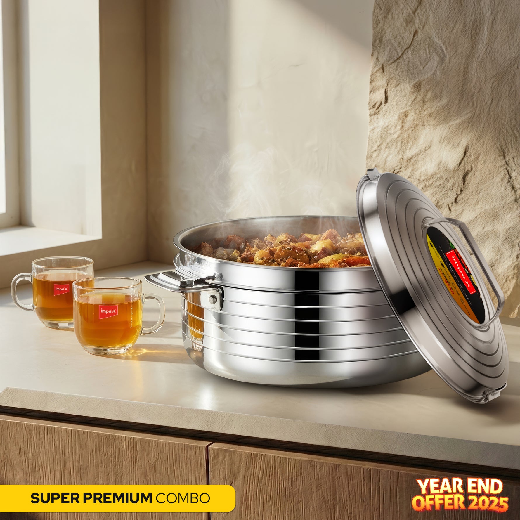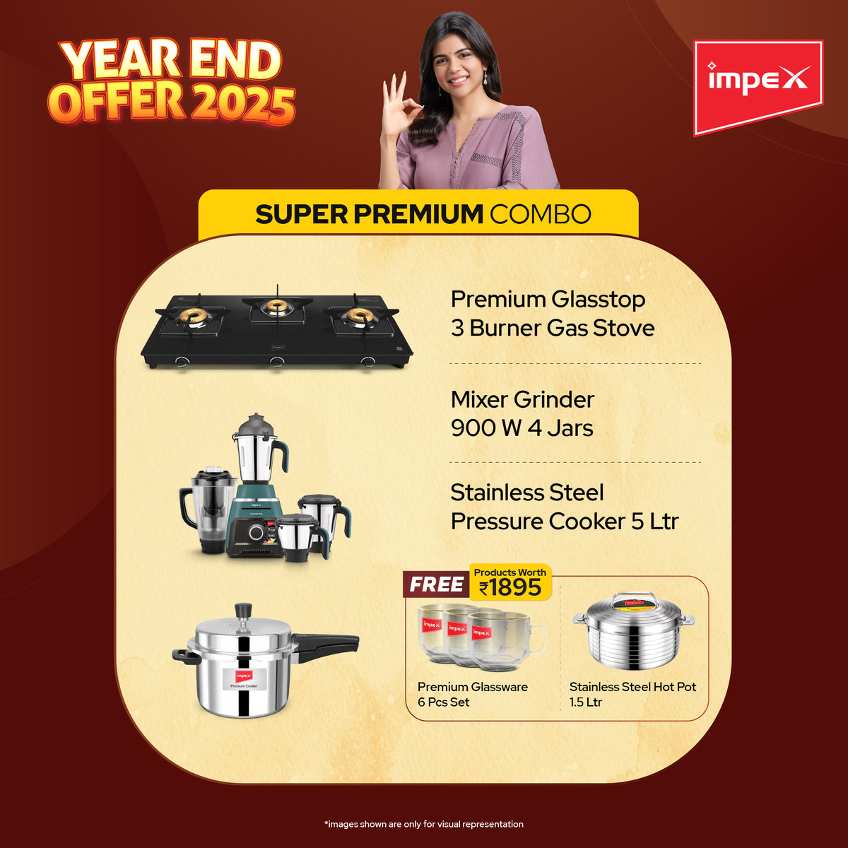 You’ve got a powerful mixer grinder, a durable stainless steel pressure cooker, a modern 3-burner glasstop stove, an insulated hotpot set, and premium gold-ring glassware. Together, these products cover cooking, serving, and dining needs with Impex’s signature durability and design.