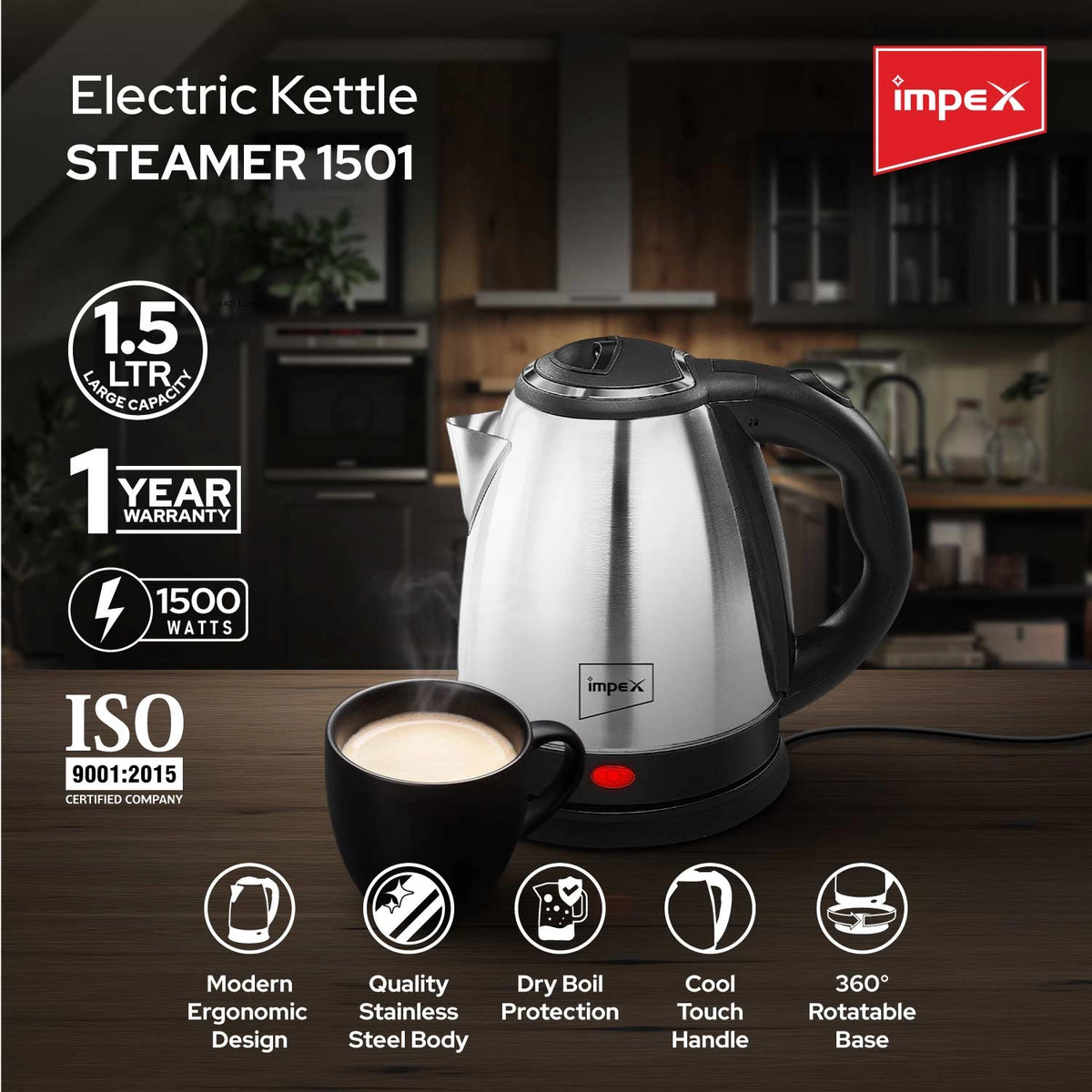 Impex STEAMER-1501 Stainless Steel Electric Kettle (1.5 Litre,1500 Watts,Silver)
