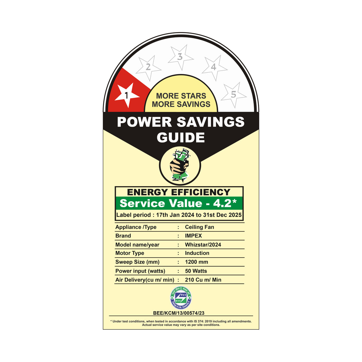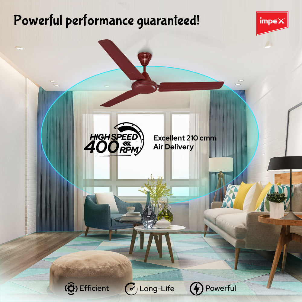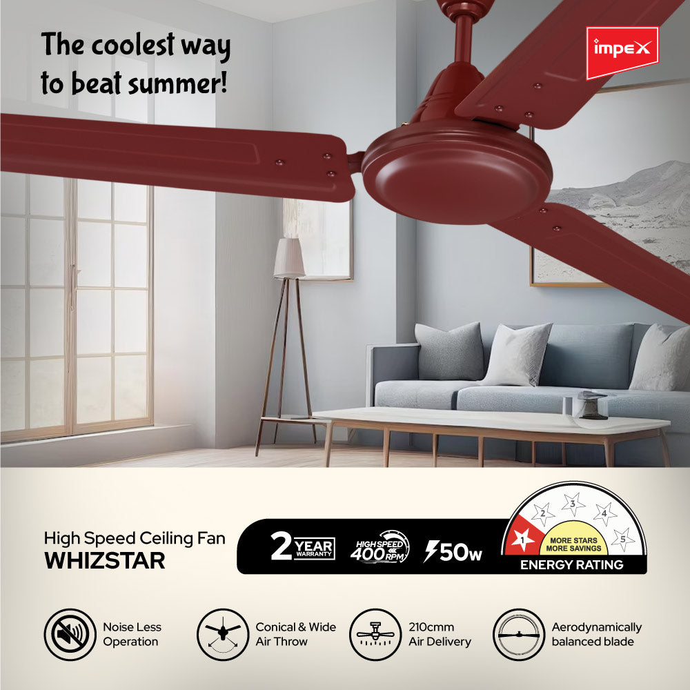 Impex introduces you WHIZSTAR CHERRY BROWN High-Speed Ceiling Fan, It has a high speed 400 Rpm. The ceiling fan is vibration free, therefor you will not hear a sound during the time of operation. It has an excellent and attractive design which suits your room as your wish.