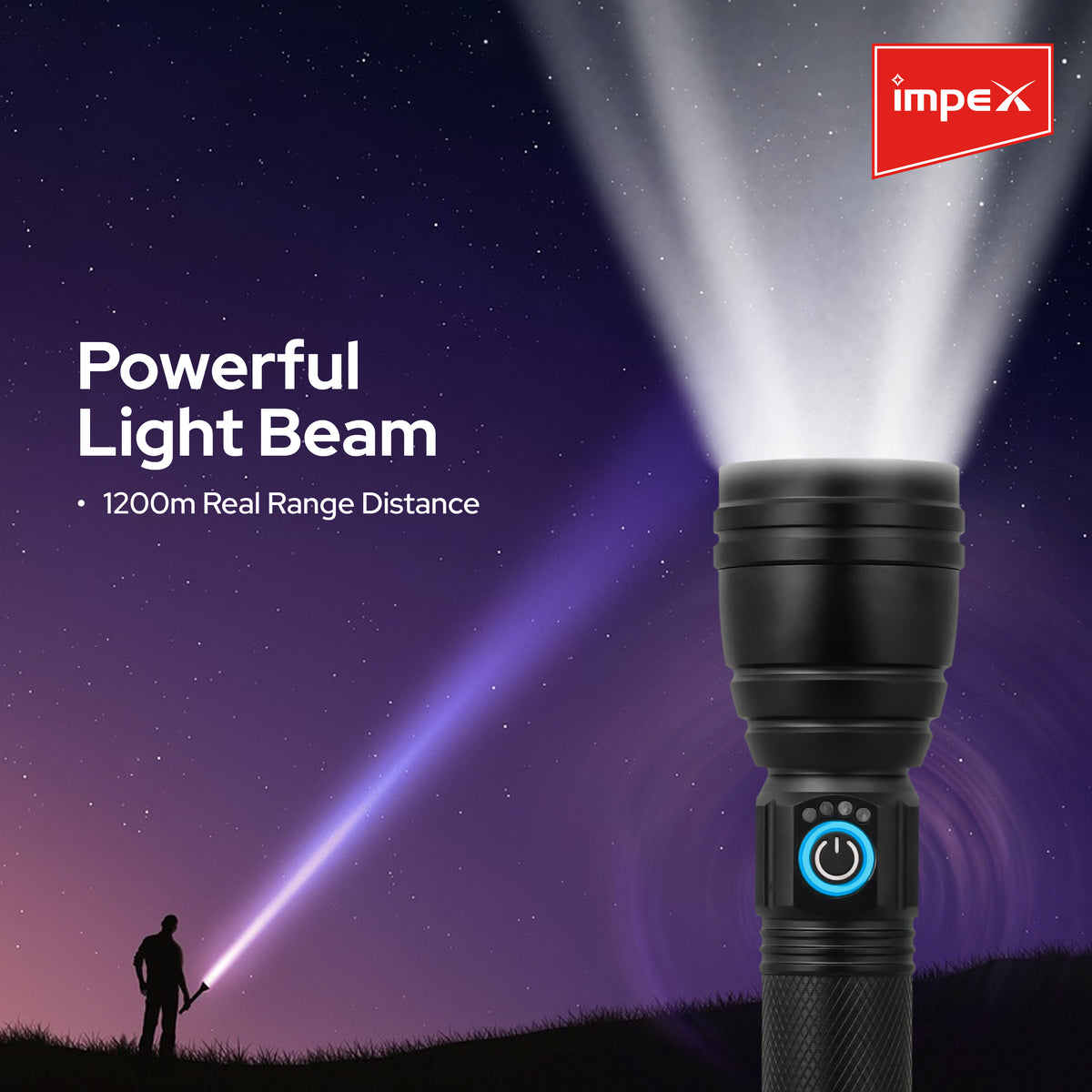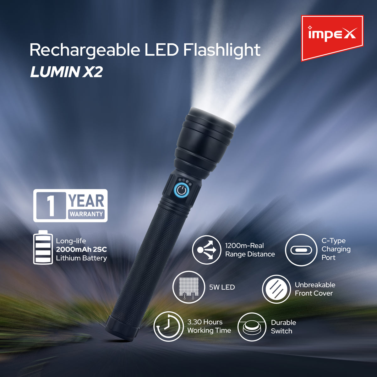 Illuminate your path with the versatile and compact Impex Lumin X2 Rechargeable Torch Light. Crafted from robust aircraft aluminum in a sleek black finish, this torch is built for durability and easy portability. It features a bright 5W SMD LED that emits 220 lumens of cool white light (7000K), ensuring clear visibility in various conditions.