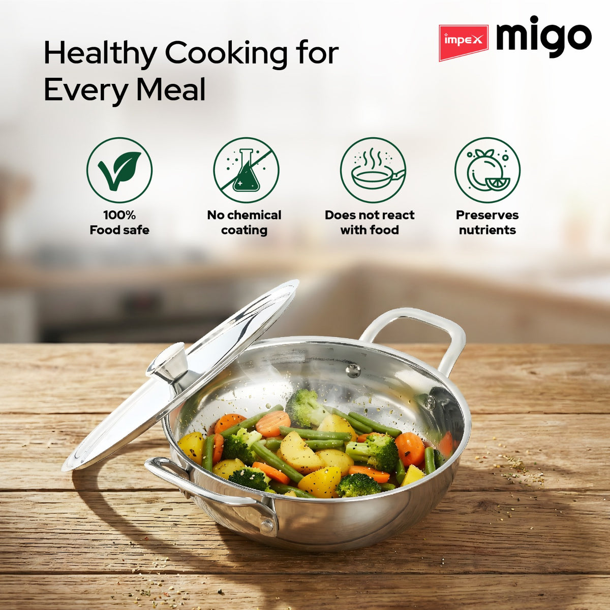 The Food Grade Stainless Steel Interior ensures your cooking remains healthy and toxin-free, while the Non-Rustic Material guarantees long-lasting brilliance. The kadai is equipped with Super Strong SS Wired Handles and a Premium SS Lid with a StayCool Knob for maximum safety and convenience. Whether you are using it on an induction cooktop, a gas stove, or even in the oven, this Dishwasher Safe kadai is built for the modern kitchen and backed by a 5-year warranty.