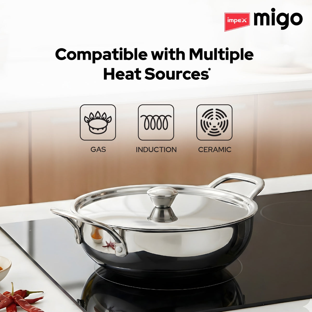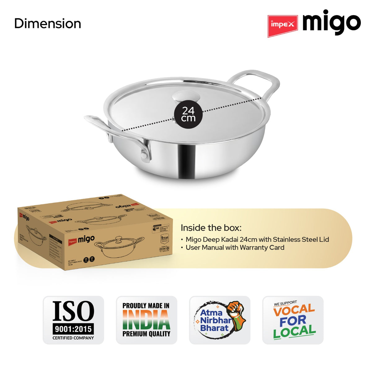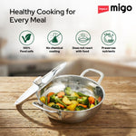 Migo Triply Ultra-Thick Deep Kadai - Uniform Heating, Super Strong SS Wired Handles and Non-Rustic Material Kadhai 24 cm diameter with Lid 2.9 L capacity (Triply, Induction Bottom)