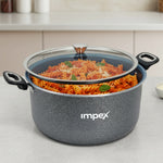 "Cook delicious biryani and other meals with the Trucera 8L Biriyani Pot. This ceramic-coated aluminum pot features a non-stick surface, induction-compatible base, and a glass lid. Perfect for family meals, it offers even heat distribution and easy cleanup.