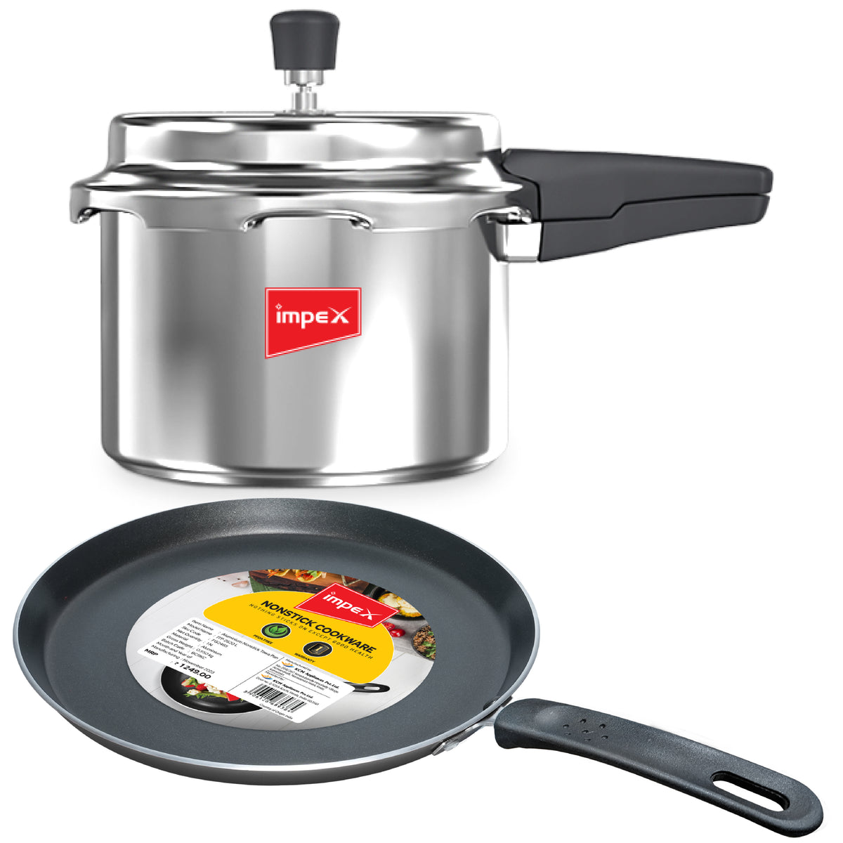 Impex Norma 3 L Non-Induction Base Aluminium Pressure Cooker with Outer Lid (Silver) and Induction Base Nonstick Aluminium Tawa Pan (IKP-2465)