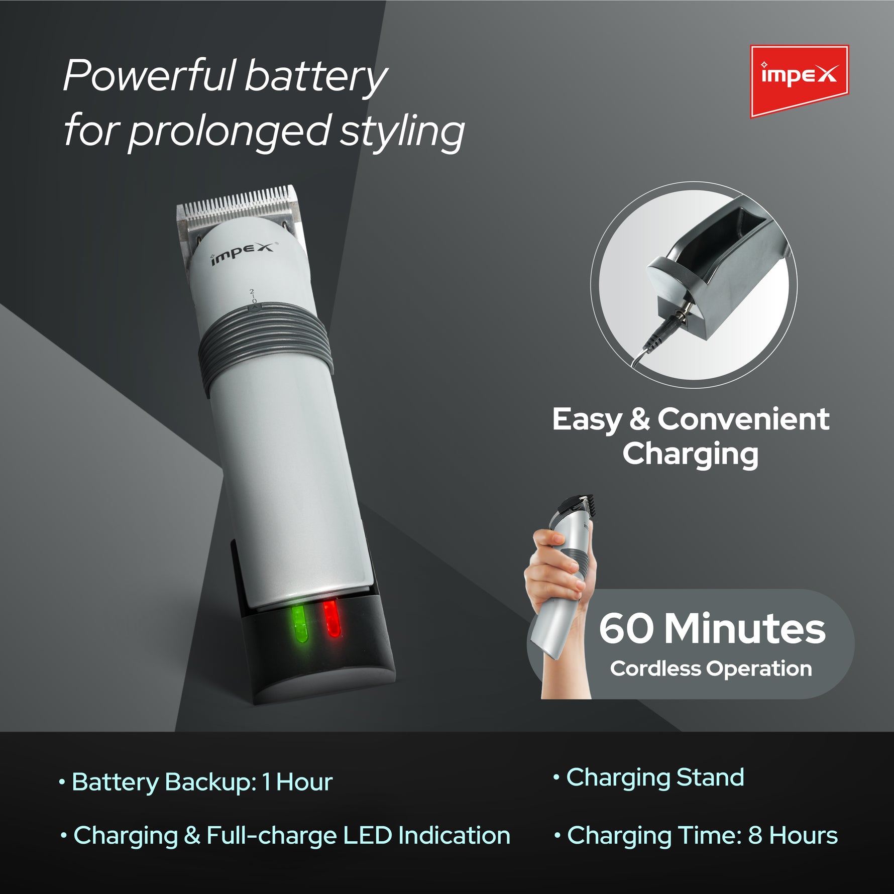 Achieve a perfectly groomed look with the Impex Tidy IHC5 Cordless Hair Trimmer. Designed for precision and ease of use, this trimmer features a powerful DC motor and sharp, stainless steel blades for a smooth, efficient trim every time. The silver-colored ABS body is sleek and durable, while the included charging stand provides a convenient way to store and power your device. With five clip-on comb attachments, you can effortlessly achieve a variety of cutting lengths from 4mm to 20mm.