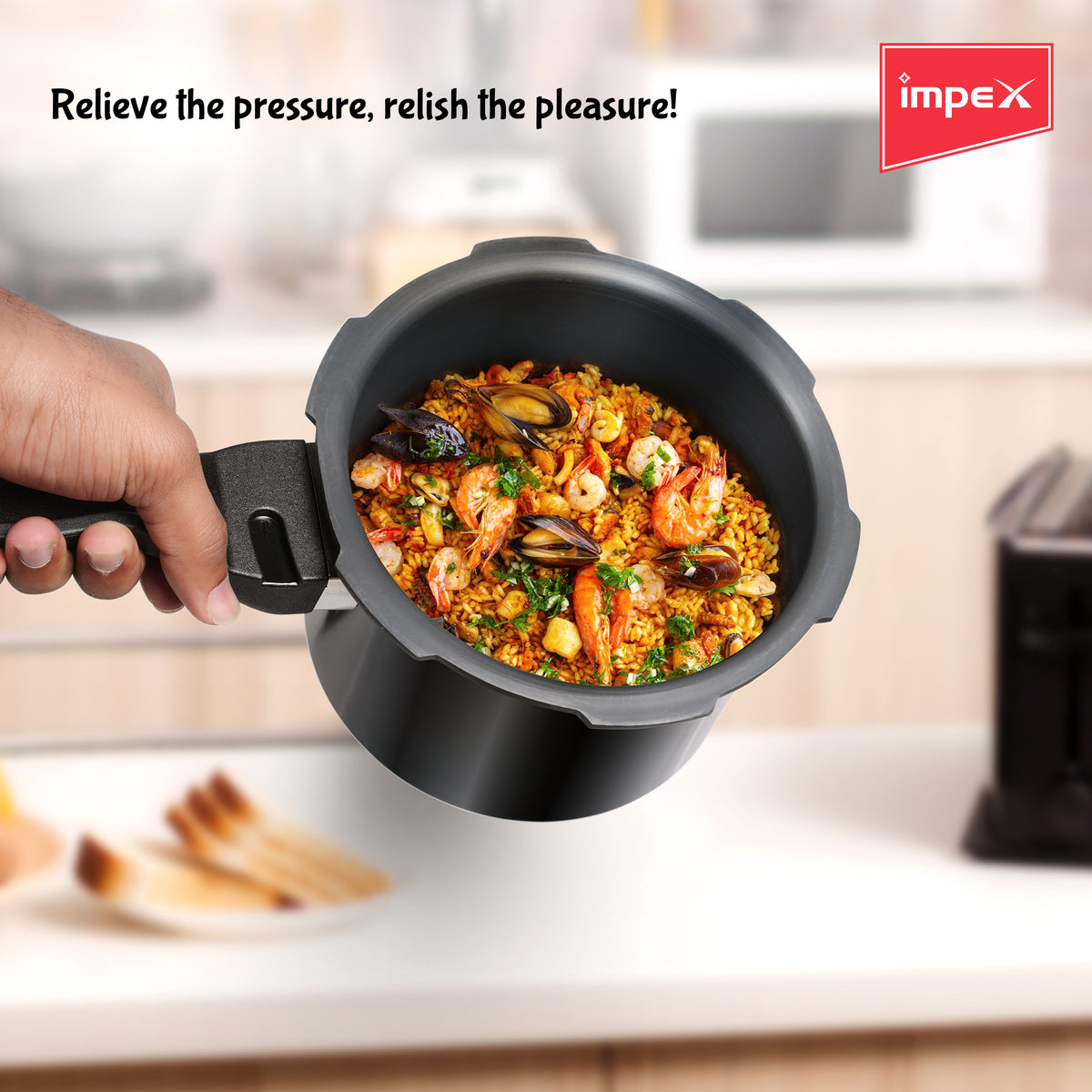 Presented in a sleek black color, this pressure cooker adds a touch of sophistication to your kitchen. Backed by a generous 5-year domestic warranty, the Impex Hard Anodized Dripless Aluminium Pressure Cooker comes complete with a sales package containing 1 pressure cooker and a warranty card.