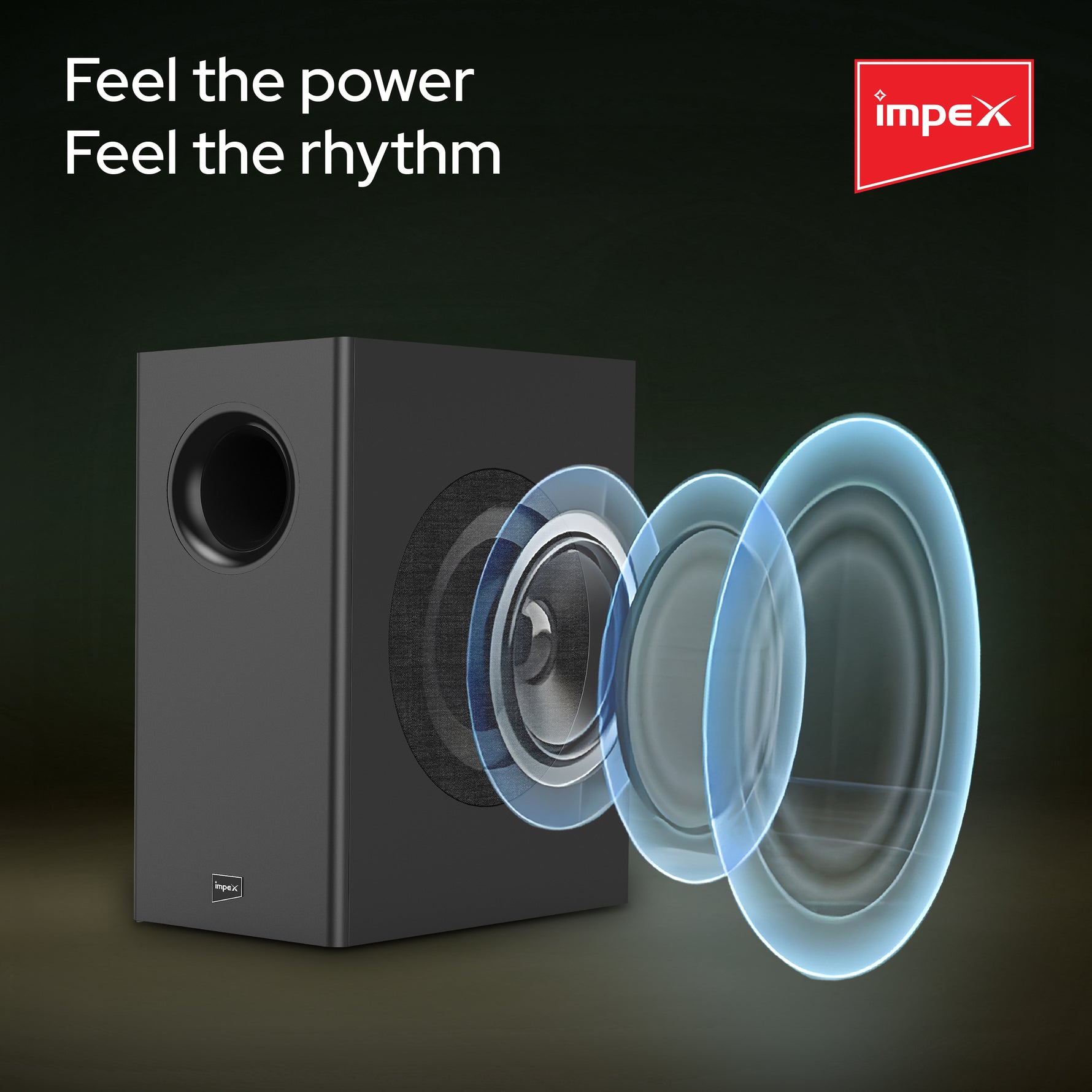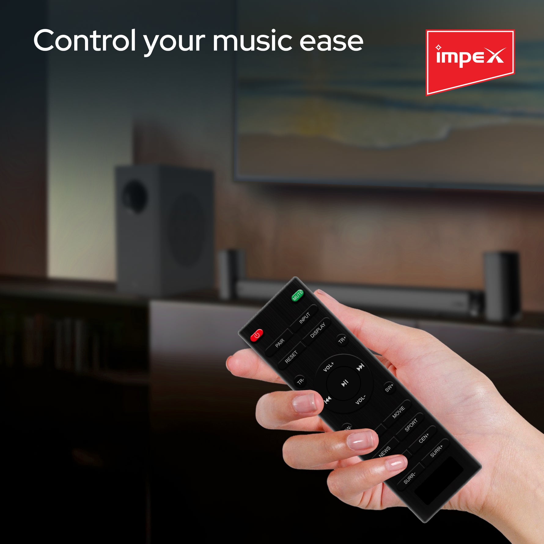 Transform your home entertainment with the powerful Impex BoomBar HK800 Soundbar. This complete audio system delivers an immersive sound experience with a total rated output of 210W. It features a 2.1 channel setup with a main soundbar, a wooden cabinet sub-woofer for deep bass, and two surround speakers for true multi-dimensional sound. With Dolby Audio support and multiple sound modes (Music, News, Movie, 3D), you can enjoy cinematic sound tailored to your content. Connect your devices seamlessly with Bluetooth 5.0, ARC, Optical, and USB 3.0 inputs. Its elegant design with a metal front panel and a wooden woofer cabinet makes it a stylish addition to any living room.