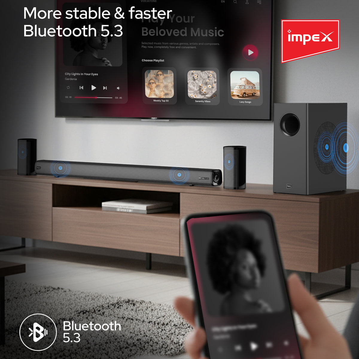 2.1 Channel System: A dedicated soundbar, a powerful wireless sub-woofer, and two surround speakers for a rich audio experience.