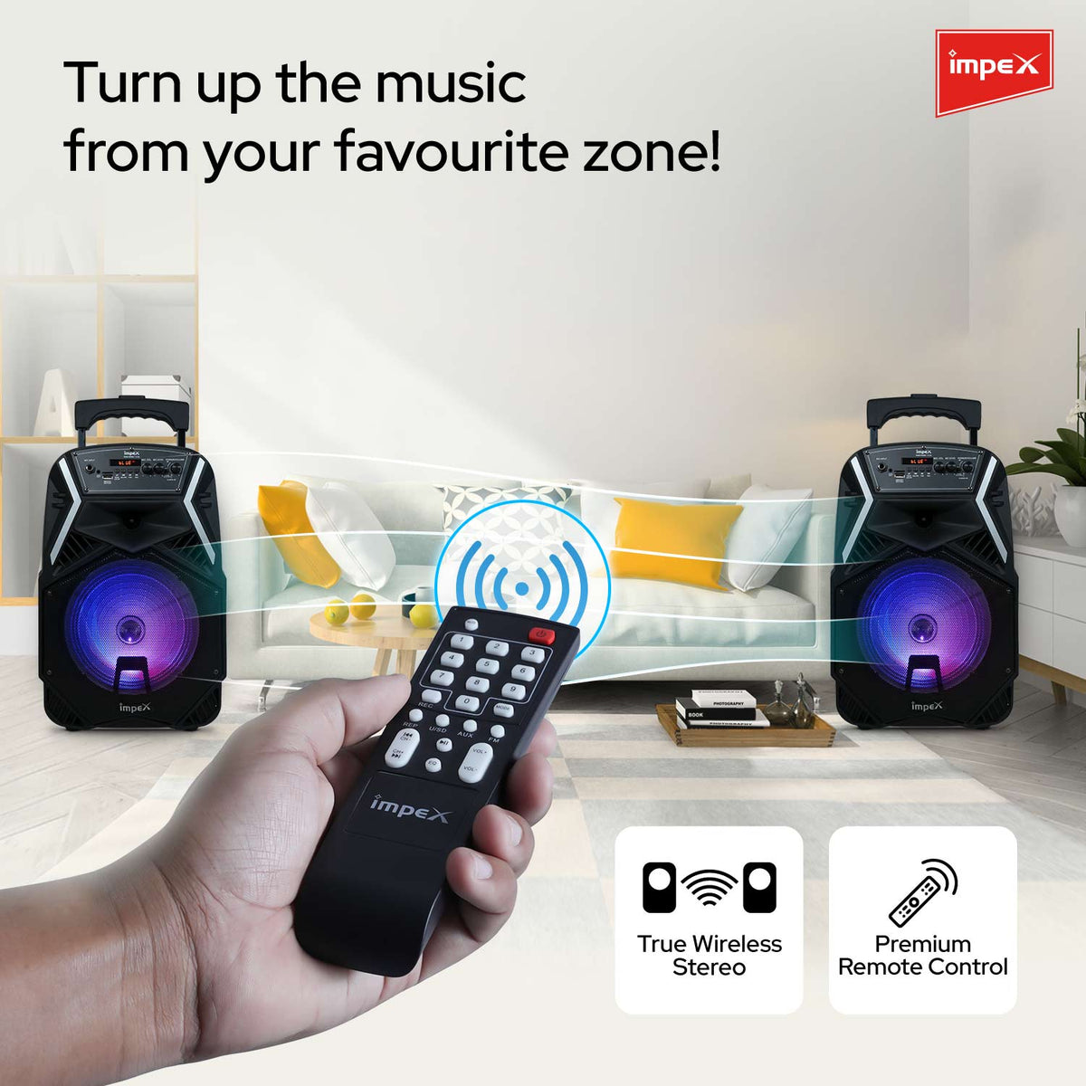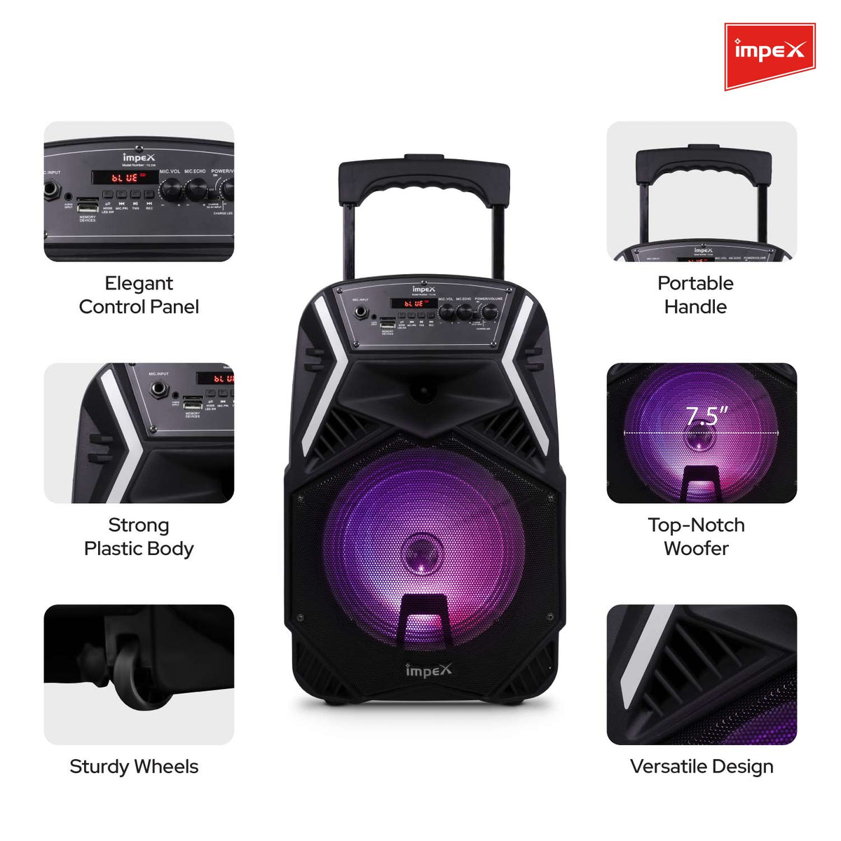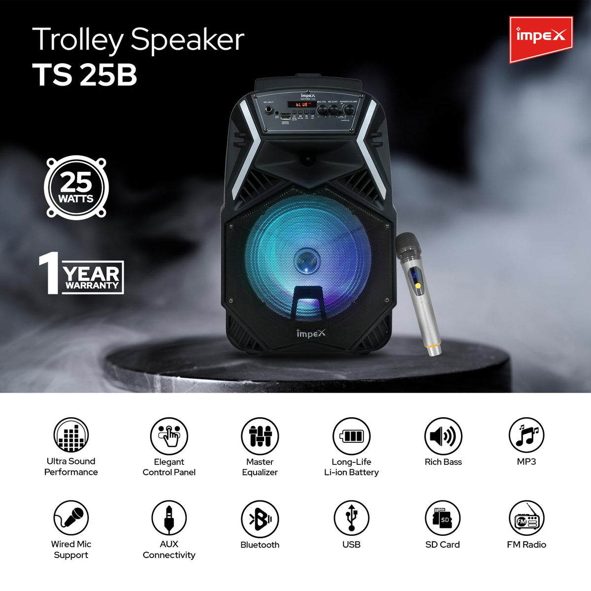 Impex TS-25B 25 Watts Multimedia Portable Trolley Speaker with USB/SD/TF/FM Radio/AUX/Remote/Bluetooth/Wireless Mic & DJ LED Light Function (Black)