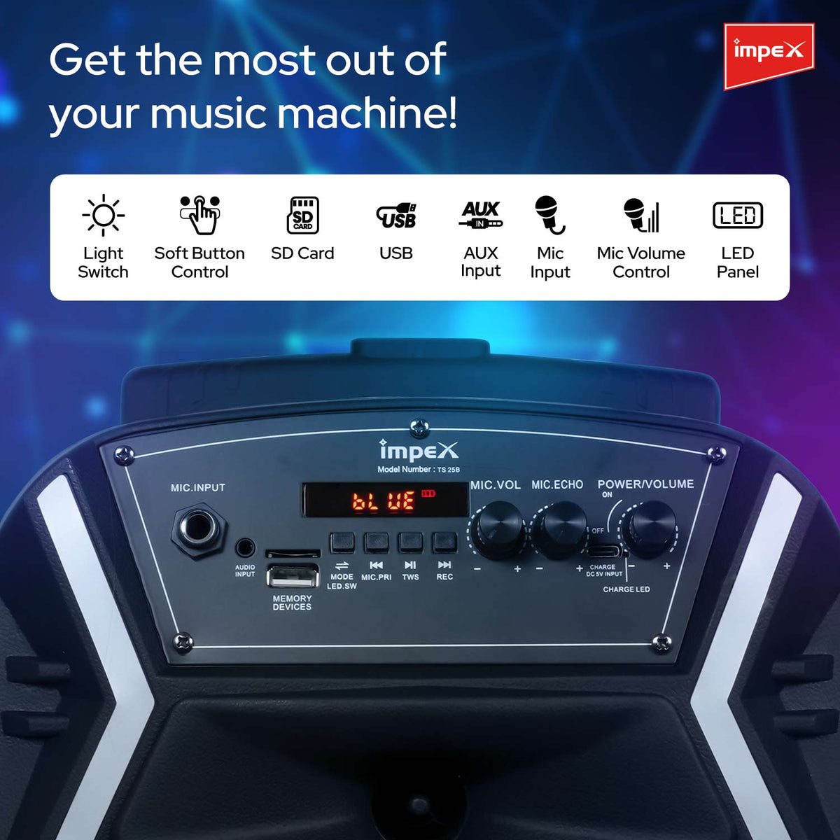 - You can connect through USB,BLUETOOTH,SD,MMC . FM RADIO also available enjoy your live music. A party doesn't mean playing sound loudly, you need to give music with environment acoustically and reverberate in the ears. So you need a good party speakers. Party speaker TS 25B comes with ultra modern sound technology. It guarantees utmost reliability, extreme portability and unbelievable sound fidelity