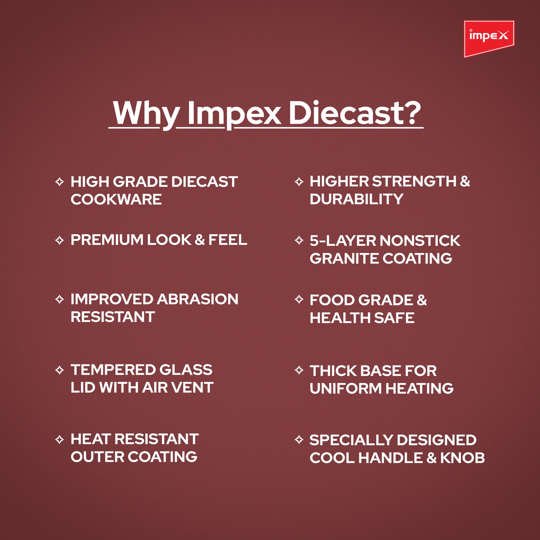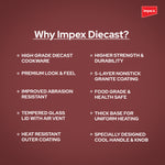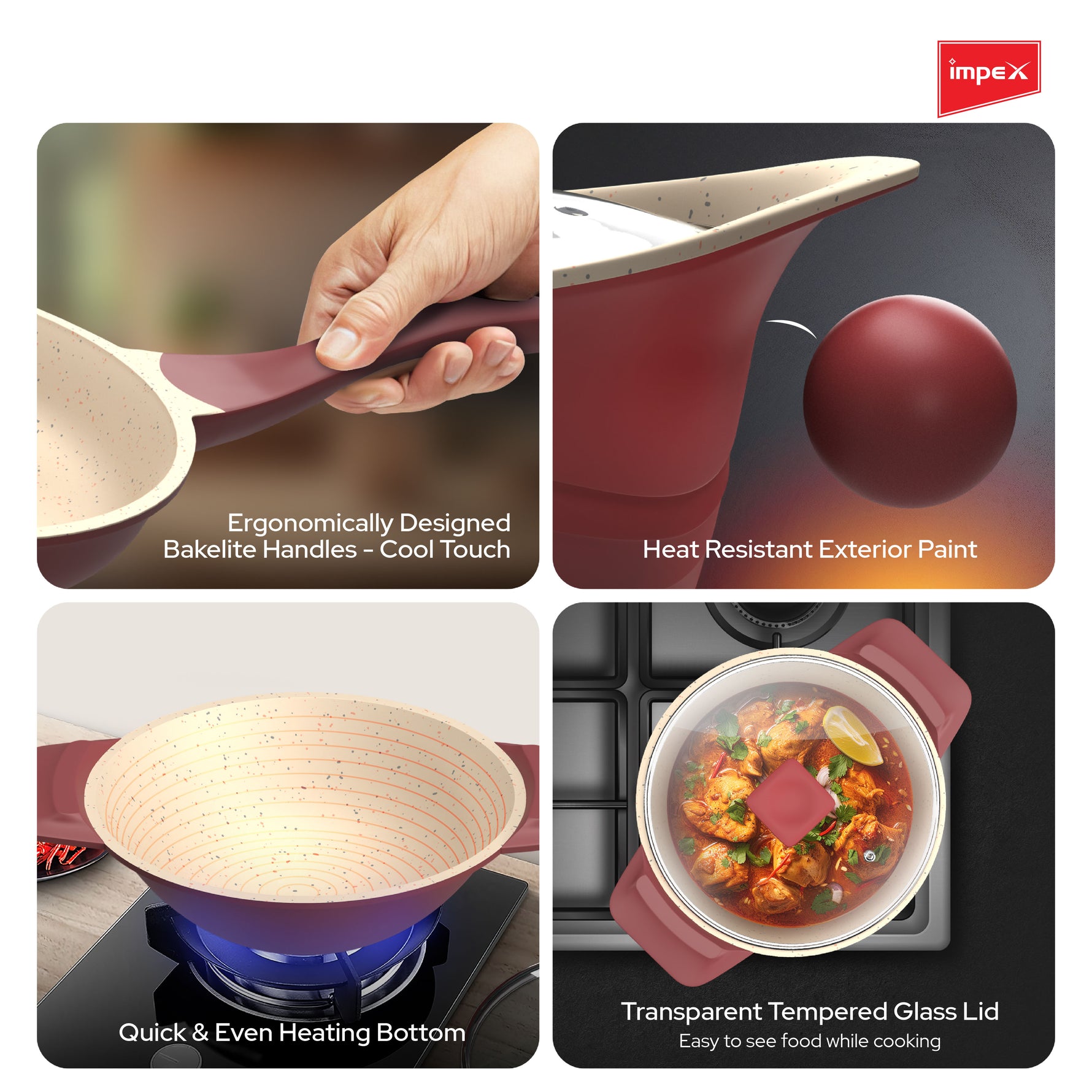 Upgrade your kitchen with the Impex RUBY 3Pcs Diecast Non-Stick Cookware Set, designed for durability and healthier cooking. This set features a high-grade Granite Coating that offers superior non-stick performance and high abrasion resistance, ensuring the cookware lasts longer and withstands daily use. The diecast construction provides excellent heat retention and even cooking. By requiring minimal oil, this set promotes healthy cooking while making cleanup effortless.