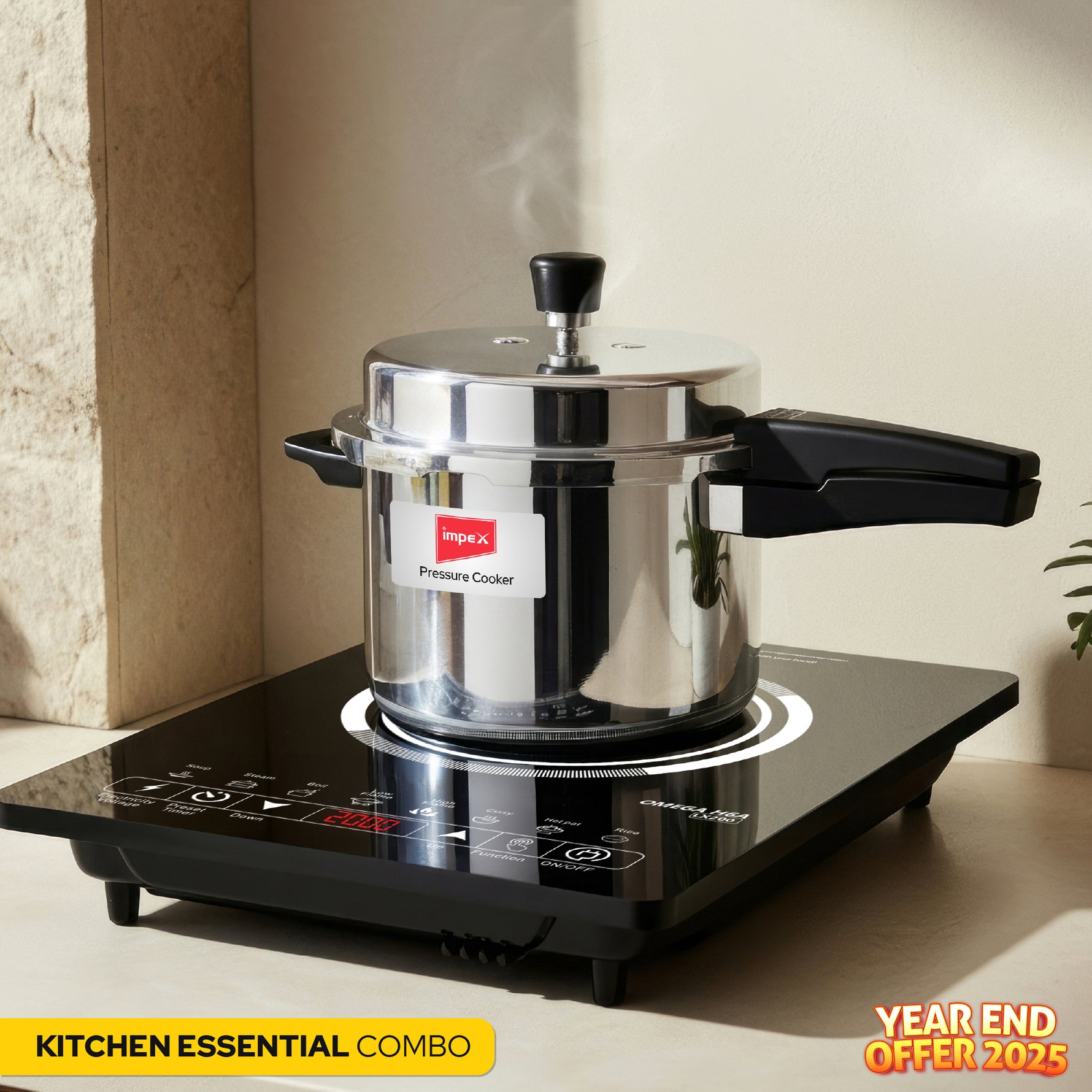 • Energy-efficient induction cooktop paired with a durable pressure cooker
