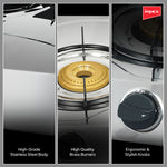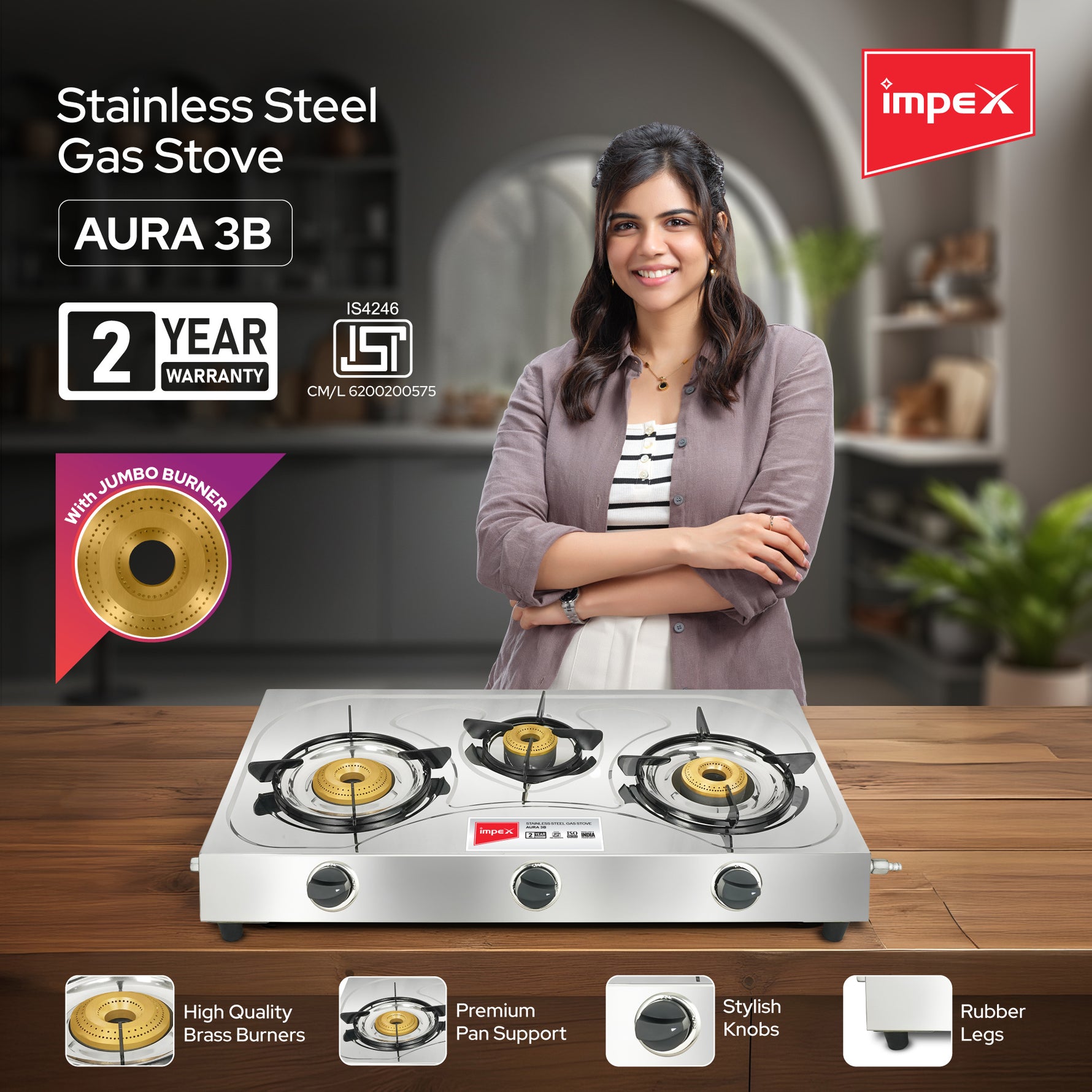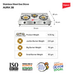 Impex Aura 3B Stainless Steel 3-Burner Gas Stove with 1 Jumbo, 2 Medium Burners, and 2-Year Warranty