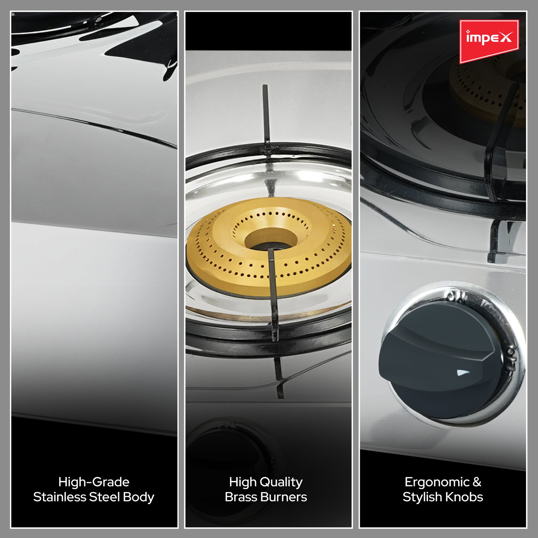 The Impex Aura 3B Gas Stove is a perfect blend of durability and high-performance, designed to meet the demands of a modern kitchen. Crafted from a superior quality stainless steel body, this stove is built to be rust-proof and easy to clean, ensuring it maintains its elegant shine for years. It features a versatile combination of one jumbo burner and two medium burners, allowing you to cook a variety of dishes simultaneously with maximum efficiency. Backed by a 2-year warranty, the Aura 3B gas stove is a reliable and stylish addition to your home.