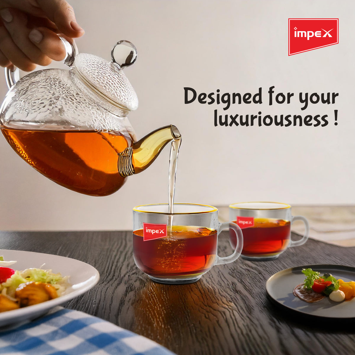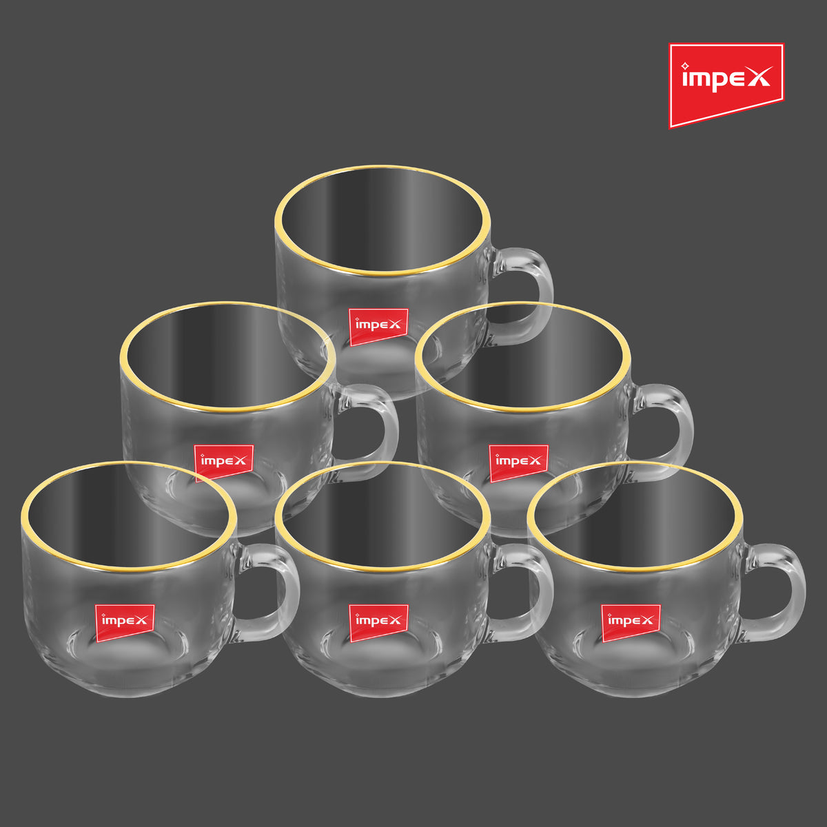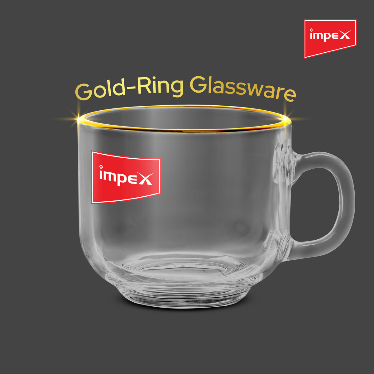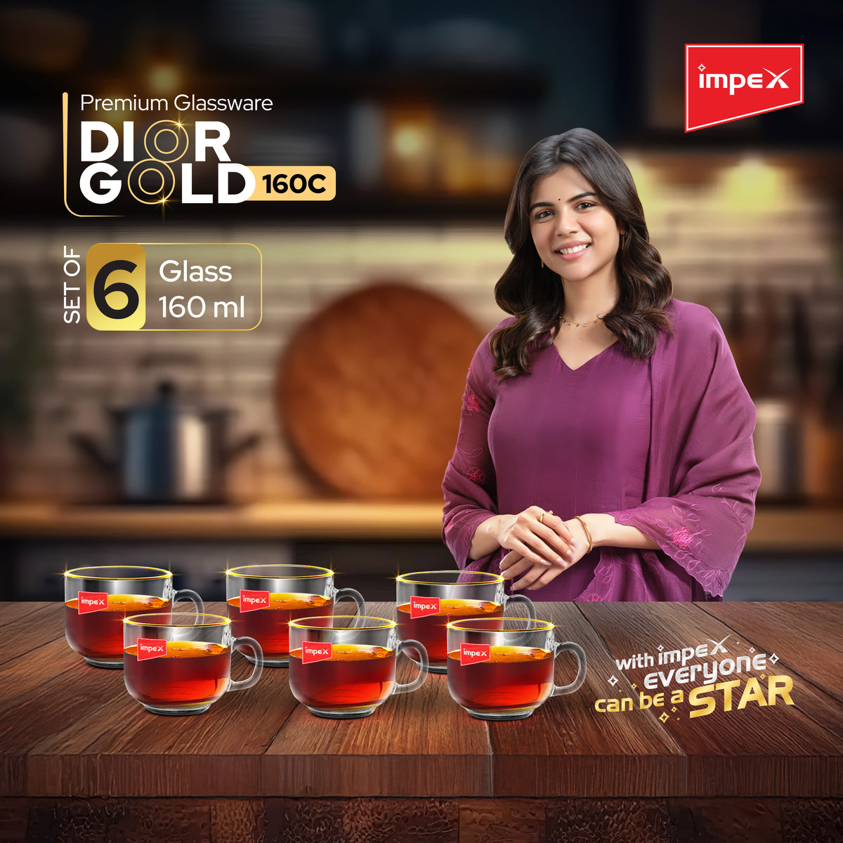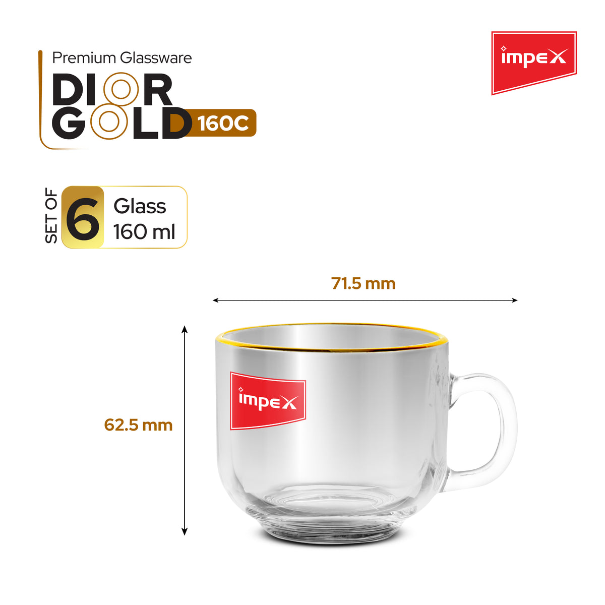 Introduce a blend of sophistication and utility to your home with the Impex Premium Glassware Dior Gold 160 C. This exquisite set of 6 glasses features a premium gold ring design that enhances the elegance of any dining or serving setup. With a capacity of 160 ml per glass, these are ideal for serving juices, water, and other beverages. Crafted from high-quality glass, these glasses ensure durability and clarity while adding a luxurious touch to your collection.