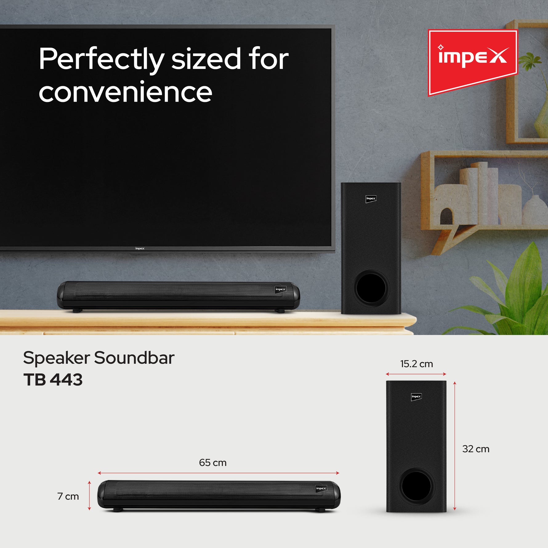 Enhance your home audio experience with the Impex TB 443 Soundbar. This 80W system includes a soundbar and subwoofer for immersive, room-filling sound. Enjoy versatile connectivity with Bluetooth 5.3, AUX, Optical, ARC, and USB inputs. The sleek black design complements any home décor, and the wall-mountable option adds to its versatility.